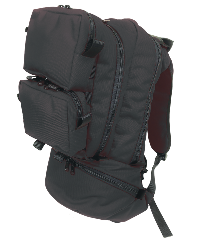The back pack has a web carrying handle, padded contoured shoulder straps, chest strap and waist strap as well as slot provisions for a hydration pack hose. This is made using DuPont® Cordura® and #8YKK self repairing zippers. It is available in black or red and weighs 36 oz. The overall dimensions are 21”L x 12”W x 12”D.