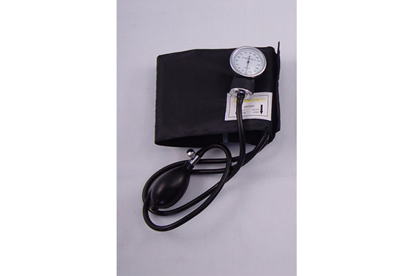 An adult aneroid sphygmomanometer, white-faced 300 mm Hg no pin stop manometer with black numerals.