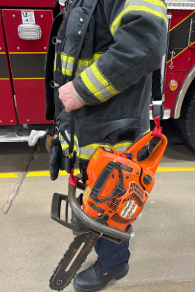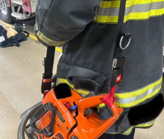 Chainsaws typically don’t come with a carrying strap, and it is imperative that firefighters keep 3 points of contact when climbing a ladder. The saw carrying strap allows the firefighter to safely climb a ladder for roof operations with both hands free. The strap is constructed with 2 seatbelt buckles for quick release when it is time to go to work. It is adjustable at both ends with large D-rings suitable for use with firefighting gloves. The portion of the strap that connects to the tool is a 1” sewn webbing loop that girths around the saw handles and is sized so that it does not fall off the saw when the sling is disconnected.