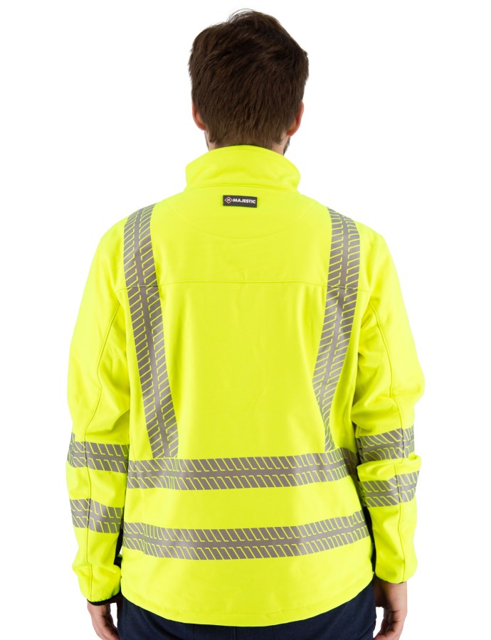 - High visibility yellow softshell jacket with black in all the areas that get the most soiled