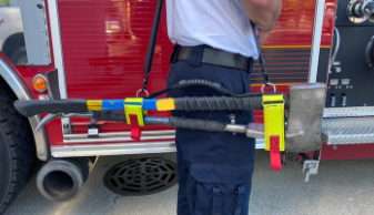 The irons strap secures a flathead axe and halligan bar together with straps that cinch tight and do not allow the strap to slide on the tools. There are 2 easy pull tabs for quick removal of the strap. The 2 carrying options allow the firefighter to carry the tools with a gloved hand or sling the irons over their shoulder for a hands-free option. The design of the strap provides even weight distribution for a more ergonomic carry.