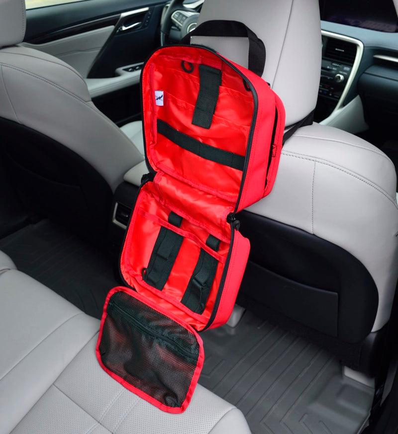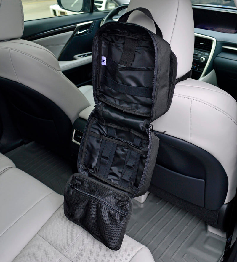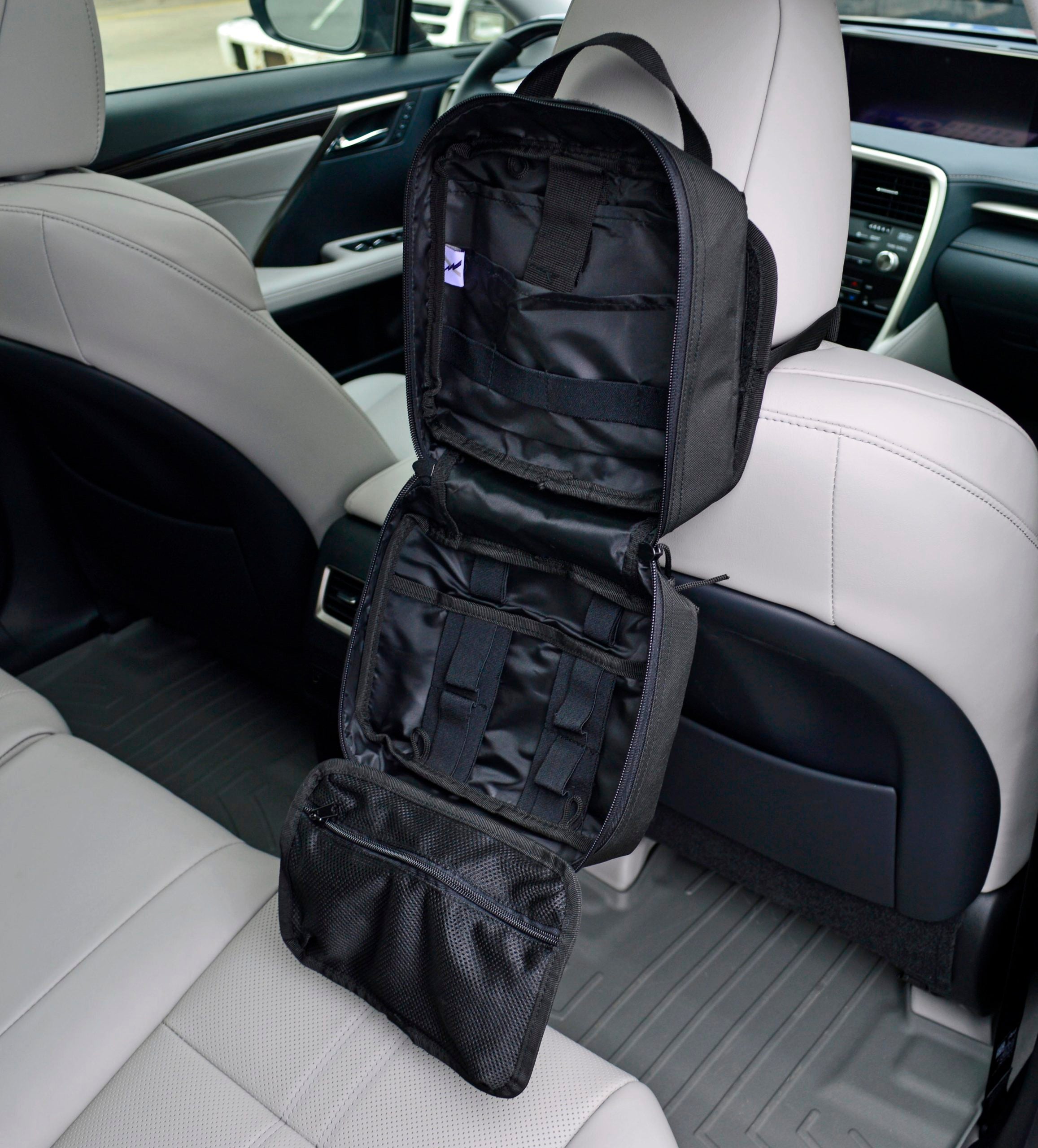 The LXPB50 from Lightning X is designed to universally attach to any vehicle headrest, or alternately any MOLLE compatible gear or bag with at least 5 rows of loops. The main bag attaches to the rear base via a hook & loop panel so that it can be easily removed in the event of an emergency with only the pull of your hand. Additionally, the bag can be opened while still attached to the base on a headrest and three tiered panels are revealed. The top two panels have various sizes of elastic tool loops in addition to pockets for storing supplies. The bottom panel is a zippered mesh compartment that is also easily removable via the hook & loop attachment to the bag. The rear attachment panel is reinforced so that it is strong enough to attach to the headrest or bag without sagging, but is pliable enough to contour to the shape of your headrest. Finally, the front of the bag is covered with a laser-cut hook & loop MOLLE panel for storing additional tools, mounting morale patches, or attaching additional MOLLE gear. This panel comes with a rubber RED CROSS emblem included with the bag. With dimensions of 10.5″L x 8.5″W x 4.5″H, this bag is large enough to hold a well equipped gunshot/hemorrhage kit, or a multi-person first aid kit.
