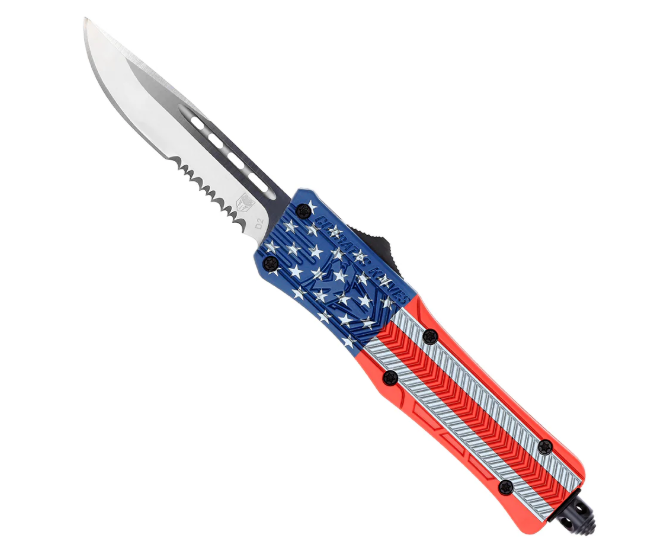 This OTF knife features a pocket clip, a glass breaker for emergencies and includes a nylon sheath.