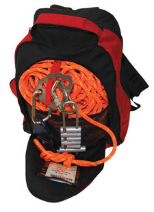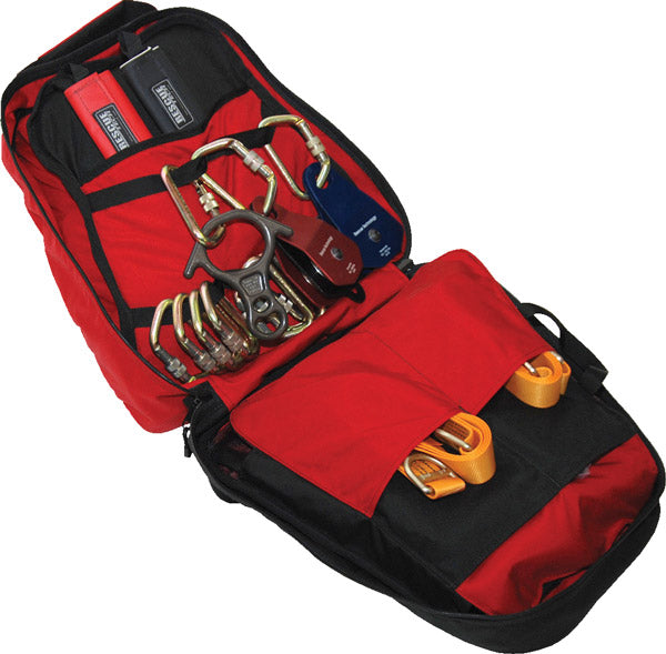 A full backpack style equipment storage/carrier. Features a rope bag section with room for 200 ft. of 1/2 Access Lifeline PLUS space for a pre-rig rescue system. This feature is easily accessible without opening the main compartment. The main compartment features RescueTECH's exclusive expanding compartment storage system. The system effectively doubles the storage space for webbing, slings, and rope guards by placing a divider in the main compartment. Adjustable Shoulder and waist straps will accommodate all rescuers. Waist pads will actually expand to fit larger waists. The semi-rigid internal frame supports gear. All straps may be tucked into special storage areas to prevent tangling with other equipment in the compartment.